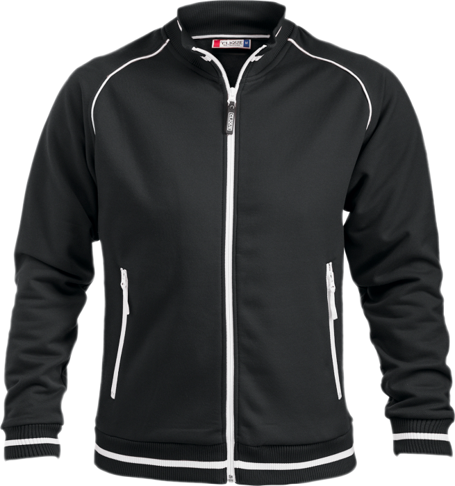 Unisex jacket in structure knit with brushed inside. Contrast stripes at collar, bottom hem and sleeve. Two front pockets with contrast zip closure.